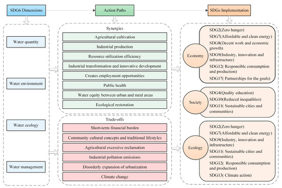 The United Nations 2030 Agenda for Sustainable Development has established 17 Sustainable Development Goals (SDGs) and 169 specific targets to monitor global progress in sustainable development in terms of the economy, society, and the environment, with SDG6 “clean water and sanitation” being a core goal [1]. Water resources are fundamental natural assets and strategic economic resources that underpin socioeconomic development. They play an essential role in food production, energy supply, health security, ecosystem service supply, and environmental sustainability [2]. However, under the combined pressures of global climate change and human activities, water security challenges, such as shortages, pollution, and ecological damage, have become critical barriers to sustainable development [3]. Currently, 26% of the global population struggles to access safe drinking water. Furthermore, the number of urban residents affected by water shortages is expected to rise from 930 million in 2016 to 1.7–2.4 billion in 2050. As a sustainability framework for interconnected social–ecological systems, achieving the SDGs encompasses more than merely accomplishing individual targets. Complex interactions exist among the SDGs, manifesting as synergies (where two SDGs improve or decline together) or trade-offs (where one SDG improves, while the other undermines) [4]. These interactions significantly influence the feasibility and effectiveness of achieving the SDGs. Therefore, a comprehensive understanding of synergies and trade-offs is essential for setting priorities, assessing goal feasibility, enhancing policy coherence, optimizing resource allocation, and promoting systematic progress toward sustainability [5].