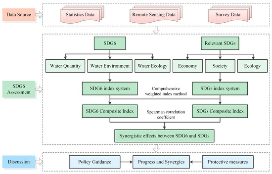 Analysis of the sustainable utilization of water resources from the dimensions of water quantity, water environment, water ecology, and water management provides more valuable insights [35]. Similarly, SDG6 also evaluates water resource systems across these four dimensions. The SDGs cover various aspects of sustainable development, including economy, society, and ecology dimensions [36], and effectively characterize the level of sustainable development in cities. Using multi-source data, this study calculates the composite index of SDG6 and eight related SDGs in Chenzhou city through a comprehensive weighted index method to evaluate the progress of these SDGs. Spearman correlation analysis is employed to explore the interactions between SDGs. Based on this analysis, the study further investigates the impact of policy guidance and protective measures on SDG progress and their synergies (Figure 3).