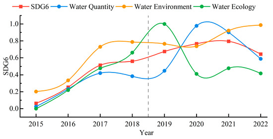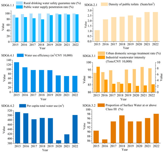 From 2015 to 2022, the SDG6 composite index for Chenzhou city increased significantly, rising from 0.06 to 0.64 (Figure 4 and Figure 5). Specifically, the index improved from 0.35 before the establishment of the demonstration area (2015–2018) to 0.72 after the establishment (2019–2022), representing an increase of over 100%. The water quantity index showed a fluctuating upward trend, increasing by more than 1.8 times after the establishment of the demonstration area compared to the period prior. The rural drinking water safety assurance rate (SDG6.1.1) reached 100%, while the public water penetration rate (SDG6.1.1) rose to 97.24%. Water consumption efficiency (SDG6.4.1) decreased by 45.56%, and comprehensive water consumption per capita (SDG6.4.2) exhibited a notable fluctuating downward trend. These results indicate that Chenzhou city has achieved significant progress in optimizing water resource allocation and promoting efficient utilization. The water environment index also experienced considerable improvement, increasing by approximately 67% after the establishment of the demonstration area compared to the period prior. The density of urban public toilets (SDG6.2.1) increased by 162.02%, reflecting the significant effectiveness of the “toilet revolution” policy implemented in the region. Water quality (SDG6.3) showed marked improvement, particularly through the reduction in industrial wastewater discharge intensity per CNY 10,000 of industrial added value, which decreased by 68.89%. In terms of water ecology, the water-related ecosystems area (SDG6.6.1) exhibited a fluctuating upward trend, increasing by approximately 70.59% after the establishment of the demonstration area compared to the period prior. In summary, the Chenzhou city has made substantial progress in the sustainable utilization of water resources, demonstrating significant advancements across water quantity, water environment, and water ecology dimensions.