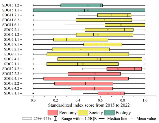 From 2015 to 2022, the annual average scores of 19 SDG indicators related to SDG6 in Chenzhou city ranged from 0.41 to 0.79, and 9 indicators were higher than the overall average score (0.57), accounting for about half of the total indicators. The distribution of scores across the indicators was relatively balanced (Figure 6). After the establishment of the demonstration area (2019–2022), the average score for each indicator (0.75) is about twice compared to the period before the area’s establishment (2015–2018), which had an average score of 0.38. Specifically, the scores of indicators in the society dimension are slightly higher than those in the economy and ecology dimensions. Among these, indicators such as the harmless treatment rate of domestic garbage (SDG11.6.1), the comprehensive utilization rate of general industrial solid waste (SDG12.4.2), and the per capita green area (SDG11.7.1) score higher. In comparison, the percentage of renewable energy power generation (SDG7.1.1) and the mortality rate for children under the age of five (SDG3.2.1) score lower.
