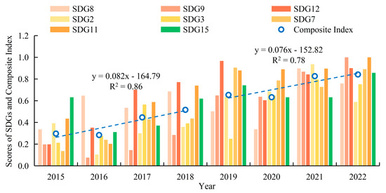 From 2015 to 2022, the SDG composite index and individual SDG indexes showed a fluctuating upward trend, and the composite index increased from 0.30 to 0.84. Following the establishment of the demonstration area in 2019, the composite index increased by approximately 89.74% compared to the pre-establishment period (Figure 7). The linear regression analysis of the composite index reveals a distinct shift before and after the establishment of the demonstration area. From 2015 to 2018, the steeper slope indicates a period of rapid growth. After 2019, the slope is relatively gentle, reflecting a stabilization in progress. This shift suggests that initial policy implementation drove quick progress, while the later phase marks the consolidation of the effectiveness of policy measures. The trend highlights the transition from rapid advancement to steady development in SDG implementation. During this period, significant improvements were observed in the indexes for SDG7, SDG9, and SDG12, which increased by 551.25%, 406.50%, and 354.16%, respectively. These results indicate that the Chenzhou city has made substantial progress in energy efficiency, industrial production, sustainable production, and consumption. However, the COVID-19 pandemic in 2020 caused a notable decline in the SDG composite index. Over time, the score gap between the various SDGs has gradually narrowed, with a trend accelerating significantly after the establishment of the demonstration area in 2019. This indicates that, under the comprehensive management policies for sustainable development in the demonstration area, the level of coordinated development among the SDGs in Chenzhou city is improving.
