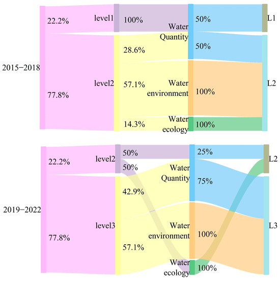 To assess the sustainable development of SDG6 before and after the establishment of the demonstration areas, the SDG6 indicators are classified into three levels based on their scores using the equal interval method: level 1 [0, 0.33], level 2 (0.33, 0.67], and level 3 (0.67, 1] (Figure 8). Policy measures have a significant impact on the sustainable utilization of water resources (SDG6), demonstrating differential effects across different dimensions. Specifically, from 2015 to 2018, level 2 indicators dominated (77.78%), while from 2019 to 2022, level 3 indicators predominated (77.78%), reflecting a substantial improvement in the overall level of sustainable development. Before and after the establishment of the demonstration area, the water quantity indicators improved from levels 1 and 2 to levels 2 and 3, with an increasing proportion of indicators in higher levels, reflecting the sustainability of improvements in water quantity. The water environment indicators have been raised from level 2 to level 3, indicating significant effectiveness in water environment governance. Although water ecology indicators remained at level 2, their overall values have improved. The policy measures in the demonstration area have yielded significant results in enhancing the sustainable utilization of water resources, particularly in water environment governance and water quantity improvement. However, due to limitations related to urbanization expansion, the water ecosystem indicators have remained stable in the region. The effects of policy measures vary across different dimensions of water resources, suggesting the need for optimized governance strategies to achieve more comprehensive sustainable development.