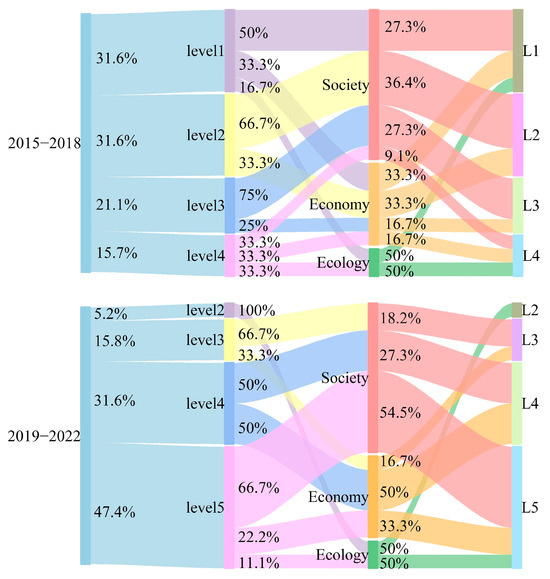 To assess the sustainable development of related SDGs before and after the establishment of the demonstration areas, the related SDGs indicators are classified into five levels based on their scores using the equal interval method: level 1 [0, 0.2], level 2 (0.2, 0.4], level 3 (0.4, 0.6], level 4 (0.6, 0.8], and level 5 (0.8, 1] (Figure 9). Policy measures have a significant driving effect on sustainable development, with differentiated impacts across various dimensions. In terms of specific indicators, from 2015 to 2018, levels 1 and 2 were predominant (63.16%), whereas from 2019 to 2022, levels 4 and 5 became the dominant categories (78.94%), indicating a significant improvement in the overall level of sustainable development. From different levels, among the indicators scoring above 0.6 (levels 3 and 4), the proportion of indicators in the economy, society, and ecology dimensions was equal from 2015 to 2018. However, from 2019 to 2022, the proportion of society dimension indicators was 1.8 times that of the economy dimension. Specifically, in the society dimension, the proportion of indicators scoring above 0.6 increased from 9.09% in 2015–2018 to 81.81% in 2019–2022, while those scoring below 0.4 (levels 1 and 2) dropped from 63.63% to 0, indicating a notable improvement in social sustainable development. A similar trend was observed in the economy dimension, where the proportion of indicators above 0.6 increased from 16.67% in 2015–2018 to 83.33% in 2019–2022, and those scoring below 0.4 fell from 66.66% to 0. Across all dimensions, society and economy indicators were mostly at levels 1 to 4 in 2015–2018, while ecology indicators were primarily at levels 1 and 4. By 2019–2022, society and economy indicators had improved to levels 3 to 5, and ecology indicators were at levels 2 and 5. The comprehensive management policy for sustainable development in the demonstration area has effectively promoted the enhancement of various SDGs, particularly achieving breakthrough progress in the society dimension, significant improvements in the economy dimension, and stability in the ecology dimension.