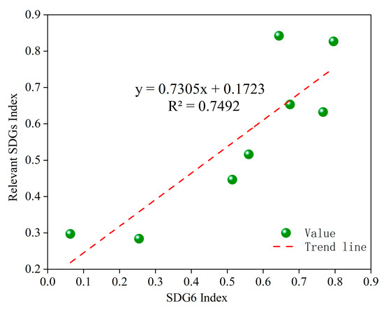 The linear fitting method was employed to analyze the comprehensive impact of SDG6 on related SDGs. The results revealed that the impact coefficient of SDG6 on related SDGs was 0.73, with a significant positive correlation at the 1% level. This indicates that improvements in the sustainable utilization of water resources in Chenzhou city had a notable positive influence on the achievement of related SDGs. Specifically, for every one-unit increase in SDG6, the combined level of related SDGs increased by 0.73 units (Figure 10).