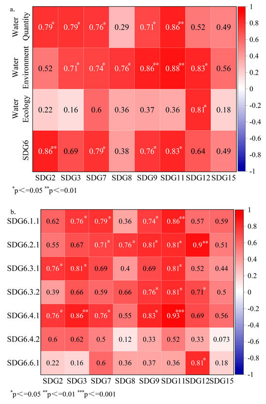 Spearman correlation coefficient between the dimensions (a) and specific indicators (b) in SDG6 and related SDGs.