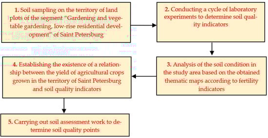Depending on the segment and its market activity (frequency of transactions with land plots on the land market), the methods for taking into account the quality of soils in the cadastral valuation of agricultural lands will differ. But in this case, the necessary initial data for the valuation of the said lands are the availability of factors for assessing the qualitative condition of the soils. Within the framework of the study, it was proposed to consider the soil quality score as an integral indicator of such an assessment, the determination of which was carried out using the example of Saint Petersburg through independent soil sampling and laboratory research in the Laboratory for Assessment of Technogenic Transformation of Ecosystems of the Empress Catherine II Saint Petersburg Mining University [40]. Due to the fact that during cadastral valuation, it is necessary to take into account the soil fertility and the influence of natural factors, as factors of part I of differential land rent of type I, the process of conducting soil studies will differ from the methods adopted by GOSTs. The algorithm for assessing the quality of soils by obtaining an integral indicator in the form of a quality score is presented in Figure 2.