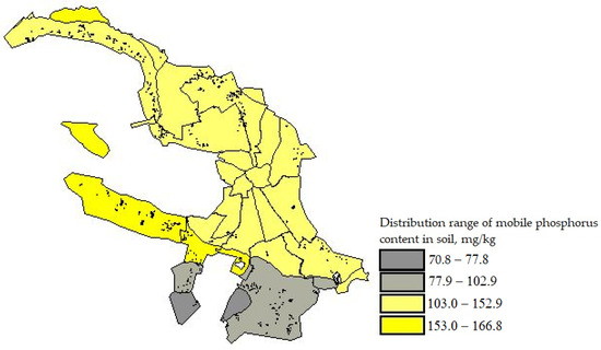 It is worth noting that the values of soil moisture content varied from 20.5% to 56%. The most humid soils were concentrated in the central areas of the city on the northwestern and southeastern sides. At the same time, soil samples taken in the locations of GNPPs, ANPPs, and IHC located near water bodies turned out to be the most humid. Figure 5 shows a thematic map of the content of mobile phosphorus in the soil. According to the presented map, the content of mobile phosphorus in the soil varied from 77.8 kg to 166.8 kg. Most of the soils in Saint Petersburg had a high content of mobile phosphorus. The highest values of mobile phosphorus in the soil were found in the southwestern part of the city in the Petrodvortsovy and Krasnoselsky districts.