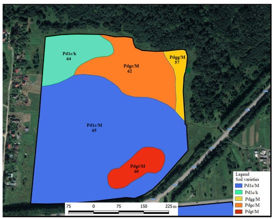At the next stage of the study, the proposed improved method for determining the cadastral value of agricultural lands in the conditions of the depressed land market of the Leningrad Region was tested based on the income approach taking into account the average weighted quality score as an indicator allowing for a comprehensive assessment of soil quality. It should be noted that since the territories of agricultural fields used in agriculture can be located within the boundaries of several soil varieties, the value of the average weighted quality score was used in this regard. Figure 6 shows an example of the location of an agricultural field within the boundaries of several soil varieties.