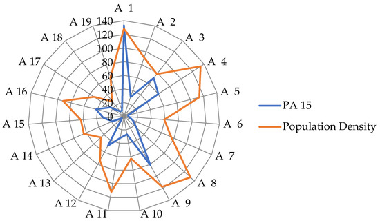 As a natural continuation of this research, an evaluation was carried out to assess how well the accessibility provided by the metro network aligns with the spatial characteristics of the territory—namely, population density. It is well known that metro network development should be prioritized in densely populated areas in order to reduce reliance on private vehicles. The objective was to compare temporal accessibility with the population density of the areas to identify a correlated development of the metro network with the density of the analyzed areas.