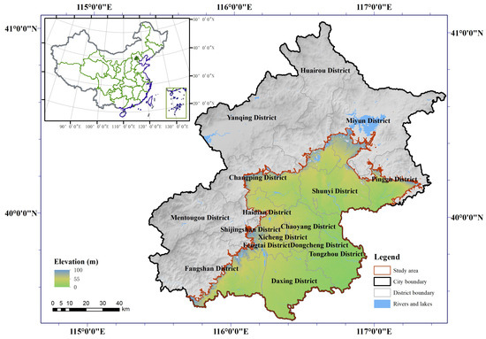 Under these climatic conditions, the Beijing Plain is a core area suitable for urban development, and its ecological services directly influence the ecosystem well-being of 70% of Beijing’s residents. Based on Beijing’s spatial characteristics and urban master planning, the Beijing Plain is defined as areas below 100 m in altitude (Figure 1). Future ecological restoration in this region will be guided by five dominant functional types: water conservation, soil conservation, biodiversity maintenance, agricultural production, and human habitat construction. These will be tailored to address the city’s natural background and ecological issues.