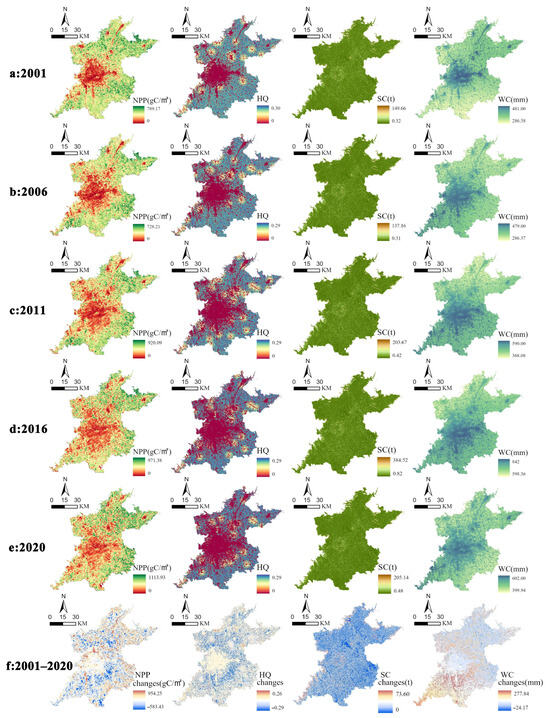 Between 2001 and 2020, the general trends for Net Primary Productivity (NPP), Soil Conservation (SC) and Water Conservation (WC) in the plain area were upward, with growth rates of 47%, 50%, and 34% (Figure 2). In contrast, Habitat Quality (HQ) remained relatively stable throughout the same period. The notable improvement in vegetation coverage across the Beijing Plain can be largely attributed to the Beijing–Tianjin Sandstorm Source Control Project, launched in 2000, which implemented large-scale afforestation, cropland-to-forest conversion, and grassland management. These ecological interventions significantly enhanced both NPP and WC. In addition, the implementation of the South-to-North Water Diversion Project (central route) has also played a critical role. Since 2014, water transfer to northern China has alleviated groundwater overexploitation, improved regional water conditions, and contributed to the enhancement of water conservation capacity. As a result, WC exhibited a marked increase in 2016, reaching a peak value of 842 mm.