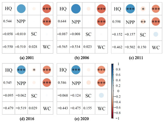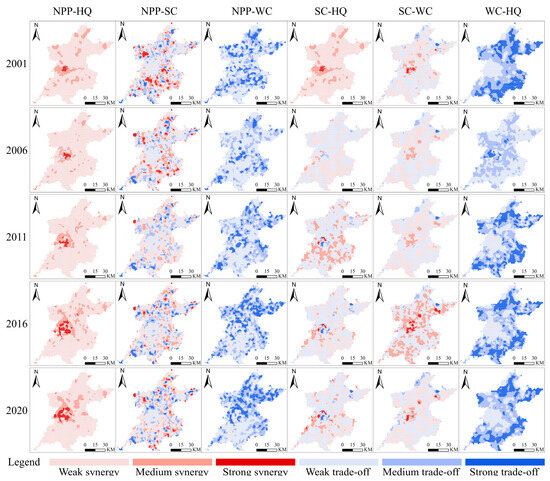 Overall, NPP-HQ, SC-HQ, and SC-WC exhibited synergistic relationships. NPP-SC showed a coexistence of both trade-off and synergy, while NPP-WC and WC-HQ demonstrated trade-off relationships. The regions exhibiting significant synergy in NPP-HQ, SC-HQ, and SC-WC were predominantly located in the central metropolitan area, with sporadic synergies in the southeast and northwest. NPP-SC had an irregular and markedly heterogeneous regional distribution pattern. The spatiotemporal distribution of NPP-WC and WC-HQ was highly similar, both showing strong synergy. NPP-WC exhibited a strong trade-off in the northern plain area, while other areas showed weaker trade-offs. The trade-off relationship between WC-HQ was stronger outside the central urban area. Over time, the synergy between NPP-HQ increased annually. NPP-SC showed a fluctuating pattern between trade-off and synergy, while the trade-off between NPP-WC and WC-HQ exhibited slight annual fluctuations but showed an increasing trend. The synergy between SC-HQ and SC-WC increased each year.