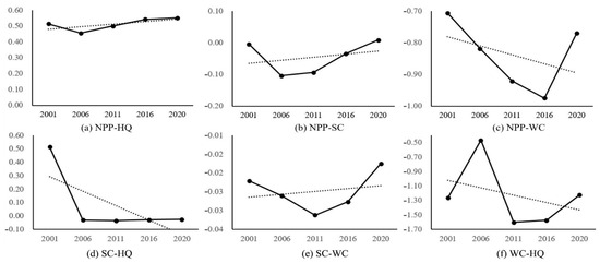 From 2001 to 2020, HQ and SC exhibited a declining trend, while NPP and WC increased. The trade-off intensity of NPP-SC, NPP-WC, and WC-HQ escalated gradually, while the trade-off intensity of NPP-HQ, SC-HQ, and SC-WC diminished.