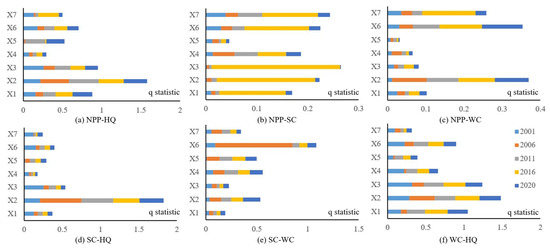The magnitude of ecosystem service trade-offs is influenced by variations in temporal and geographical scales. The optimal parameter geographic detector designated the trade-off intensity among ESs as the dependent variable, with possible components considered as independent variables. The methodology integrated many techniques to enhance data discretization, with the indicator discretization procedure elaborated in the accompanying table. Figure 6 illustrates the outcomes of the geographical differentiation study on factors affecting the intensity of trade-off among ESs in the plain area from 2001 to 2020. The land use type was the primary element affecting the trade-off intensity for NPP-HQ, SC-HQ, and WC-HQ, with average explanatory powers of 31.56%, 36.53%, and 29.64%, respectively. The explanatory capacity of the land use type demonstrated a constant upward trend over time, succeeded by factors such as the NDVI, population density, and temperature. For NPP-SC, the NDVI and precipitation had relatively strong impacts. The explanatory power of factors such as the population density, land use type, NDVI, temperature, and precipitation for the NPP-SC trade-off intensity increased significantly, from 1.08%, 0.19%, 0.15%, 3.00%, and 3.87% in 2001 to 13.04%, 19.24%, 25.24%, 12.68%, and 10.92% in 2016. However, these values all experienced sharp declines from 2016 to 2020. For NPP-WC, land use type, temperature, and precipitation were the primary drivers of spatial variation, with average explanatory powers of 7.39%, 7.07%, and 5.17%, respectively, and their influence showed an increasing trend over time. Other factors had relatively weaker impacts. Temperature exerted the greatest significant influence on SC-WC, demonstrating an average explanatory power of 21.70% over 20 years, peaking at 75.77% in 2006. Other influential factors, ranked in descending order, were elevation, land use type, and slope. Land use, temperature, the NDVI, and population density significantly influenced the level of compromise among ESs in the plain area, while elevation, slope, and precipitation exerted comparatively lower effects.