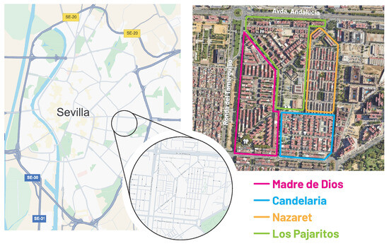 The neighbourhood of Los Pajaritos, located in the Cerro-Amate district in the east of Seville, borders the Carretera Amarilla Industrial Estate to the north, the neighbourhood of Santa Aurelia to the east, the Nervión district to the west, and the neighbourhood of Amate to the south. Along with the areas of La Candelaria, Nazaret, and Madre de Dios, Los Pajaritos forms part of the zone known as Tres Barrios (see Figure 1), which has been designated as an Area in Need of Social Transformation due to the structural conditions of poverty and exclusion affecting its residents [40].