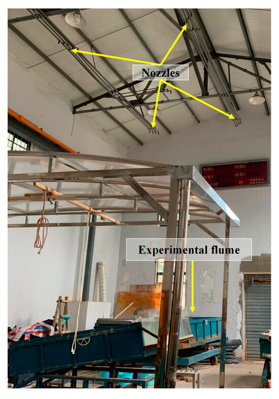 The rainfall simulation was conducted using a sprinkler-type rainfall simulator system, vertically mounted at a height of 6.0 m above the center of the experimental flume, enabling raindrops to reach terminal velocity [38] (Figure 2). Four nozzles were symmetrically arranged at the four corners of the flume to ensure uniform water distribution [29]. Following systematic calibration, the rainfall simulation system demonstrates adjustable precipitation intensity within the range of 0.5–3.5 mm·min−1. The spatial uniformity of rainfall distribution, quantified by Christiansen’s Uniformity Coefficient, exceeds 85%, thereby satisfying the ASTM standard threshold for controlled experimental conditions [39,40]. In order to determine the runoff and soil erosion responses, a rainfall intensity of 1.45 mm·min−1 was applied since this intensity has been previously used in experimental research and represented natural events based on long term meteorological data from Shenzhen [29,41].