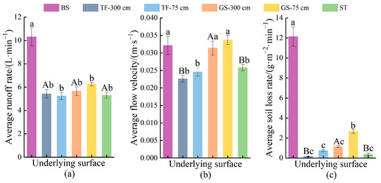 Average runoff and sediment yield characteristics of different spoil heaps. (a) Average runoff rate under different temporary vegetation measures; (b) Average flow velocity under different temporary vegetation measures; (c) Average soil loss rate under different temporary vegetation measures. Lowercase letters represent differences between BS, TF-300 cm, TF-75 cm, GS-300 cm, GS-75 cm, and ST, while uppercase letters represent differences between TF-300 cm, GS-300 cm, and ST. Where the same letter represents a non-significant difference (p > 0.05) and different letters represent a significant difference (p < 0.05).