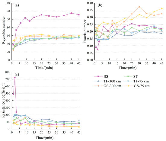 Characteristics of Reynolds number, Froude number, and resistance coefficient with production runoff over time for different spoil heaps: (a) The variation of Reynolds number with time; (b) The variation of Froude number with time; (c) The variation of Resistance coefficient with time.