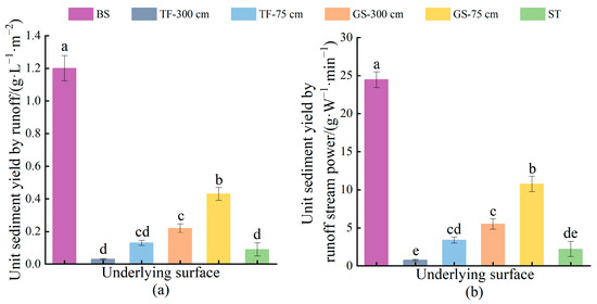 Unit runoff and runoff power sediment production: (a) Unit sediment yield by runoff under different temporary vegetation measures; (b) Unit sediment yield by runoff stream power under different temporary vegetation measures. Lowercase letters represent differences between BS, TF-300 cm, TF-75 cm, GS-300 cm, GS-75 cm, and ST. Where the same letter represents a non-significant difference (p > 0.05) and different letters represent a significant difference (p < 0.05).