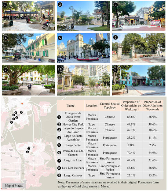 This study selected nine public spaces in Macau based on their representativeness, diversity, and research feasibility, with the aim of investigating how different outdoor environments influence aging in place and IADL performance. The selection criteria considered factors such as the concentration of elderly residents, cultural and historical context, spatial scale, and functional diversity. Particular emphasis was placed on spaces that are frequently used by older adults, especially those located in districts with a high density of elderly populations, as these environments play a vital role in supporting daily routines, physical activity, and social engagement. The nine selected sites were grouped into three categories based on their cultural characteristics and degree of embeddedness in everyday urban life in Macau: (1) Chinese, (2) Portuguese, and (3) Sino-Portuguese integrated public spaces. This classification reflects key differences in place meaning, social configuration, environmental atmosphere, and levels of local integration, which are critical for interpreting behavioral outcomes and contextualizing elderly spatial experiences in a historically layered city like Macau. Although the spaces differ in size, their selection was guided by the medium-scale characteristics typical of Macau’s largos, which are generally considered suitable for the everyday use of the elderly population.