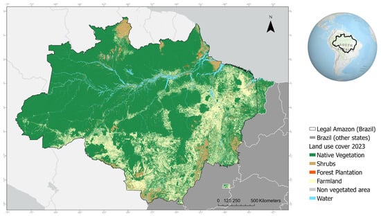 We used land cover data from the MapBiomas Project [], which provides annual classifications derived from Landsat imagery at 30 m resolution for Brazil and other regions of Latin America since 1985. The dataset, based on over 80,000 reference samples, reports classification accuracy between 73% and 95% across South American biomes. For this study, we reclassified the original 17 land cover types into five broader categories: native vegetation, pasture, crops, water, and other (including urban, mangrove, mining, and unclassified areas). “Native vegetation” combines forest and non-forest natural cover; “pasture” includes pasture, grassland, and agricultural mosaics—mostly natural pasture per MapBiomas validation. All spatial analyses were conducted using ArcGIS and R, with the SIRGAS 2000 coordinate reference system. Administrative boundaries for municipalities and the legal Amazon region were sourced from the Brazilian Institute of Geography and Statistics (IBGE).