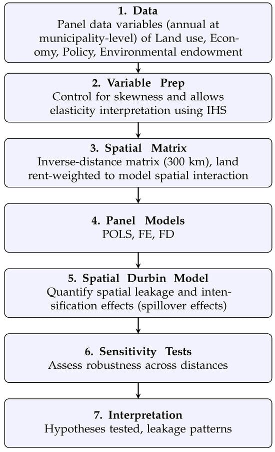 We employed a municipality-level panel data analysis for the period of 2000–2023 to assess deforestation leakage caused by forest plantation, its geographic sensitivity, and the role of livestock intensification in mitigating spillovers. The panel data approach allowed for the estimation of both temporal persistence in deforestation and spatial spillover effects. The dataset integrates land-use, economic, climatic, and spatial data, enabling a rigorous econometric analysis of deforestation leakage and the role of livestock intensification. Following the literature in Land System Science and land change modeling [,], we included multiple independent variables to capture the drivers of vegetation loss, from proximate direct causes to underlying contextual controlling variables. This controls for confounding factors, including infrastructure expansion (proxy: population density), commodity price shocks (agricultural GDP and beef price deflated), and environmental enforcement (embargoed area due to illegal deforestation). By incorporating these controls, we isolate the specific contribution of reforestation to land-use displacement while accounting for broader economic and policy influences. See summary of variables in Table 1.