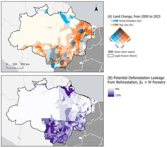 Spatial patterns of land-use change and modeled deforestation leakage in the Brazilian Amazon (2000–2023). In Panel (A), forest plantation areas are classified in four intervals: 0 to 100, 100 to 1500, 1500 to 5000, and 5000 to 58,000 hectares. In Panel (B), the breaks in the color legend for vegetation loss percentages are grouped into 0 to 25%, 25 to 50%, 50 to 75%, and 75 to 100%.