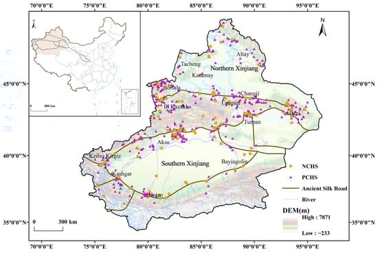 As the core distribution area of CHS on the Silk Road and a typical arid region, Xinjiang’s CHS spatio-temporal evolution laws serve as a crucial entry point for revealing the evolution of the human–environment relationship in arid regions. Taking Xinjiang as a typical case, this study utilizes multi-source historical and geographical data and GIS spatial analysis to achieve three objectives: (1) to reveal the spatio-temporal distribution evolution characteristics of CHS in historical periods; (2) to examine how natural geographical and historical-human factors influence CHS spatio-temporal distribution dynamics; (3) to extract and present crucial evidence for regional historical development insights from CHS spatio-temporal distribution analysis and propose specific proposals for regional CHS sustainable development.