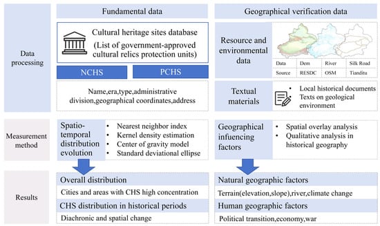 The analysis methods of natural and human factors are as follows: (1) Spatial overlay analysis. The method is performed on the selected elevation and slope data, river information, and the distribution map of CHS. Through the overlay analysis, the specific elevation and slope values of each point are obtained, and the number of points within the river buffer zone is counted. (2) Qualitative analysis of historical geography. The article combines materials such as Xinjiang local historical documents, and texts on geological environment analysis to trace the evolution process of the local natural and cultural history. In this way, it sorts out the natural and human geographical factors that influence the evolution of CHS.