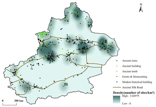 The nearest neighbor index (R) of the CHS distribution in Xinjiang is 0.386, and the Z value is −31.22. It passes the 1% significance test, indicating that CHS spatial distribution in Xinjiang shows a significant clustered distribution pattern. From north to south, 13 key cities with concentrated CHS have emerged (Figure 4), namely Altay (a), Qinghe (b), Jimunai (c), Zhaosu (d), Shihezi (e), Gaochang (f), Hami (g), Turpan (h), Korla (i), Kuqa (j), Kashgar (k), Hotan (l), and Qiemo (m). Based on the location, historical evolution, and the Silk Road branches to which they belong, the sites can be further categorized into four major areas with concentrated heritage sites: the Altai Mountains region, the Northern Route of the Silk Road, the Middle Route of the Silk Road, and the Southern Route of the Silk Road. ① The Altai Mountains region. Located in the hinterland of Altai Mountains, it includes Altay, Qinghe, and Jimunai. There is a total of 77 CHS in this area, which has the fewest CHS in Xinjiang. The sites are mainly dated back to the Pre–Qin period, with ancient tombs accounting for 50.64%. The terrain in this area is mostly alluvial platforms, with the surface covered by gravel accumulation of gobi, and sparse vegetation. This environment is conducive to the preservation and discovery of tombs [32]. ② The Northern Route of the Silk Road. It includes Zhaosu, Shihezi, Gaochang, and Hami. There are 231 CHS in total, accounting for 33.09% of the total number of sites in the study area. The types of sites are mainly ancient ruins, and most of them date back to the Pre–Qin and Ming–Qing period. ③ The Middle Route of the Silk Road. It includes Turpan, Korla, and Kuqa. There are 296 CHS in total, accounting for 42.41% of the total number of sites in the study area. This area has the largest number of CHS in Xinjiang and the highest degree of agglomeration, with two obvious high-density agglomeration areas, namely the Turpan Basin and the oasis area on the northern edge of the Tarim Basin. ④ The Southern Route of the Silk Road. It includes Kashgar, Hotan, and Qiemo. There are 94 CHS in total. The distribution of CHS is closely related to that of piedmont oases. The sites are distributed in a concentrated point-like form in the areas with dense oasis cities on the southern edge of the Tarim Basin. Overall, the ICH distribution shows a multi-core pattern with 13 key cities and four concentrated distribution areas, and they mainly extend along the routes of the ancient Silk Road routes.