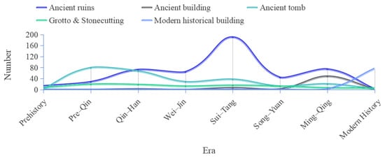 The number distribution of CHS varies greatly across different historical periods (Figure 5), showing a wave-like pattern with “three peaks and three valleys”. The first upward trend spans from Prehistory to the Qin–Han periods. Prehistory had the longest time span among the eight historical periods in Xinjiang, yet it had the fewest CHS. During the Pre–Qin period, the number of CHS gradually increased. There were a relatively large number of ancient tombs, accounting for 62.7% of the total sites in this period, which indicates that humans drove the progress of human history through a settled lifestyle. The number of CHS reached the first peak during the Qin–Han period, with a total of 159 sites. Among them, the number of types of ancient ruins increased significantly (Figure 6). The second peak period was during the Sui and Tang dynasties. During this time, the number of CHS in Xinjiang reached the highest level in its historical period, totaling 248 sites, and the number of types of ancient ruins also hit the peak, reaching 190. The third peak period was in the Ming–Qing period, with 150 sites. In this period, the number of ancient buildings increased significantly, and among them, the Karez irrigation systems accounted for the largest proportion. The three peak periods were the three crucial times when Xiyu was unified. During these periods, through military conquests, political administration, and economic and cultural exchanges, Xiyu was incorporated into the historical territory of China, resulting in obvious peak periods in terms of the quantity and types of CHS. Meanwhile, population growth and migration brought about different building techniques and demands, leading to a significant increase in the types of ancient ruins and buildings. The three decline periods occurred in the Wei–Jin, Song–Yuan, and Modern History periods, when there was social unrest, and the Central Plains governments had difficulty achieving effective unification. The numbers of CHS in these three periods were 104, 70, and 86, respectively.