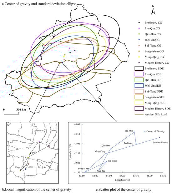 Table 1 shows that the length of the semimajor axis of the standard deviation ellipse reflects the CHS distribution pattern in Xinjiang in the east–west direction. The length of the semimajor axis was 9.53 km in the Prehistory period, decreased to 5.98 km in the Wei–Jin period, increased again to 7.82 km in the Ming–Qing period, and further decreased to 6.53 km in the Modern History period. This shows a fluctuating evolutionary trend of concentration and expansion. The length of the semi-minor axis reflects the distribution characteristics of the sites in the north–south direction. It decreased from 3.73 km in the Prehistory period to 2.22 km in the Sui–Tang period, and then increased to 3.07 km in Modern History, showing a state of first concentration and then dispersion in the north–south direction. The difference between the major and minor semi-axes decreased from 5.8 km in the Prehistory period to 2.65 km in the Sui–Tang, then increased to 5.04 km in the Ming–Qing period, and finally decreased to 3.46 km in Modern History, showing a centripetal–centrifugal trend. This fluctuating trend causes the rotation angle to change irregularly and slightly, presenting an overall “northeast–southwest” spatial distribution pattern (Figure 7a). The ellipse area has shown a “decrease–increase–decrease” change. It decreased from 111.77 km2 in the Prehistory period to 44.67 km2 in the Sui–Tang, then increased to 68.32 km2 in the Ming–Qing period and decreased again to 63.03 km² in Modern History, showing a convergence–expansion trend. In general, the CHS in Xinjiang across different periods generally exhibits an obvious pattern of concentration–expansion in both primary and secondary trends as well as overall spatial distribution.