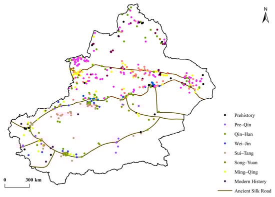 China implements a tiered management system for cultural relics protection units through a three-level framework comprising national, provincial (autonomous), and municipal (county) levels [23]. Due to the implementation of unified evaluation criteria for national-level and provincial-level cultural relics protection units, their spatial distribution characteristics can be regarded as an effective representation of the spatio-temporal pattern of cultural sites within a province, holding significant research representativeness [24]. The CHS data are sourced from the lists of national key cultural relic protection units announced by the State Council in eight batches and the lists of autonomous-region-level cultural relics protection units announced by the Xinjiang Uygur Autonomous Region in eight batches (https://ncha.gjzwfw.gov.cn/, https://www.xinjiang.gov.cn/). These lists were determined after multiple rounds of argumentation and evaluation by expert review teams and expert review committees organized by the State Council and the people’s government of the autonomous region. They are currently the only directly accessible, reliable, and officially announced data sources for cultural relics protection units. Among them, there are 134 national key cultural relics protection units (NCHS) and 573 cultural relics protection units at autonomous-region-level (PCHS) in the research area. By referring to the official websites of the State Council, the autonomous region, and local governments at all levels, detailed attribute information about the cultural relics’ protection units is obtained, including their names, dates, types, administrative divisions, geographical coordinates, and addresses. According to the research requirements, a few CHS with uncertain types and dates are excluded, and 698 CHS are retained. Based on the chronological division system, and in combination with historical studies, the political, economic, and cultural characteristics of different periods in Xinjiang, as well as existing research findings [1,25], the periods in which the CHS are located are divided into eight periods: the Prehistory (Paleolithic Age, Neolithic Age), Pre–Qin (including the Bronze Age and Iron Age), Qin–Han, Wei–Jin (including the Three Kingdoms, the Two Jins, and the Northern and Southern Dynasties), Sui–Tang (including the Five Dynasties and Ten Kingdoms Period), Song–Yuan, Ming–Qing, and Modern History. Given the continuity across different historical periods of some CHS, they are counted separately based on their respective historical periods.