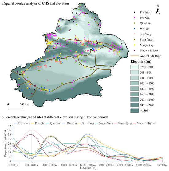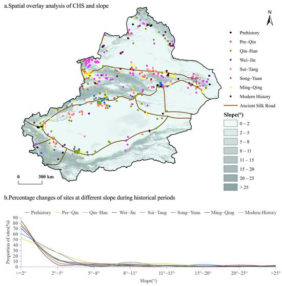 The terrain of Xinjiang has not changed much since the Prehistory period [36]. This study takes the current terrain as a reference and considers the relationship between the spatial distribution of CHS in different periods and elevation as well as slope. Specifically, the terrain to some extent determines and restricts the extension of CHS in this region. Based on the research findings of Wang [1], Zhang [36], and Zhu [37], and in combination with the local topographical features of Xinjiang, on the basis of reclassifying in the ArcGIS software, the elevation values (unit: m) in Xinjiang are divided into nine categories: [−233, 500), [500, 800), [800–1000), [1000–1200), [1200–1600), [1600–2000), [2000–2400), [2400–2800), [2800,∞). Among them, the interval [−233, 500) is classified as the first level, [500, 800) is classified as the second level, and so on. The interval of 2800 m or above is classified as the ninth level. The slope values (unit: °) in Xinjiang are divided into eight categories: [0, 2), [2, 5), [5, 8), [8, 11), [11, 15), [15, 20), [20, 25), and [25, ∞). Among them, the interval [0, 2) is the first level, [2, 5) is the second level, and so on. A slope of 25° or above is the eighth level (Figure 9a and Figure 10a). Based on the classification criteria of elevation and slope, the proportions of CHS at different elevations and slopes in each historical period are statistically calculated (Figure 9b and Figure 10b).