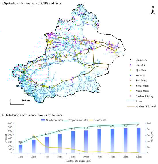 Water resources play a crucial and decisive guiding role in the formation and development of human settlements [39]. Xinjiang has a complex river system with more than 570 rivers. Most of them are inland rivers, while only a few are external rivers. The water sources of these rivers mainly come from precipitation, snow cover, and glacial meltwater in mountain ranges such as the Tianshan Mountains. The article selects rivers at levels 1–8 in Xinjiang as the main objects of analysis (Figure 11a). By using ArcGIS software, it constructs buffer zones around these rivers at intervals of 1 km, 2 km, 3 km, 5 km, 8 km, 10 km, 13 km, 15 km, 18 km, and 20 km [6], and then calculates the number of CHS in different buffer zones of the rivers (Figure 11b).