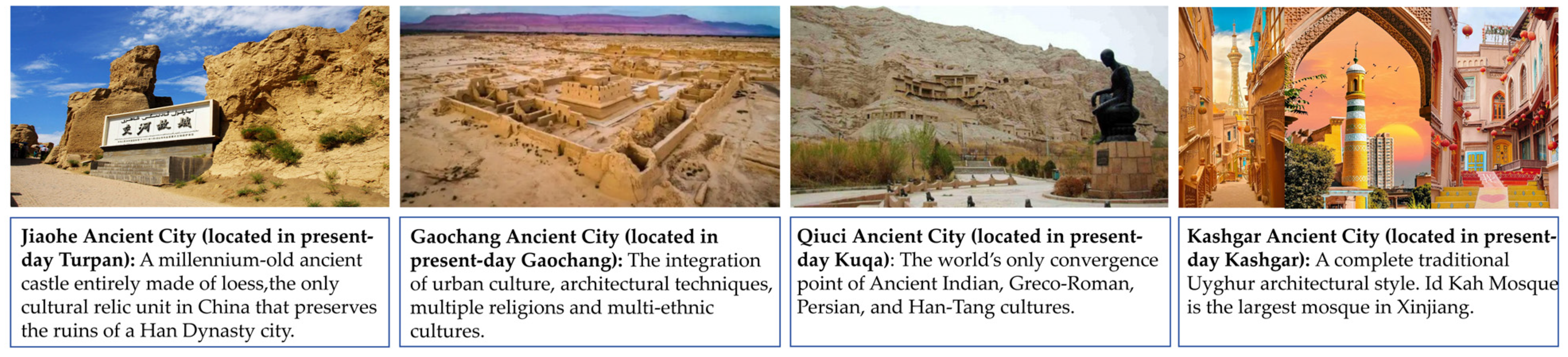Xinjiang Uygur Autonomous Region is located in the northwest of China, covering an area of 1,664,900 square kilometers, which is the largest provincial administrative region in China (Figure 1) [19]. It has a geographical layout of “three mountains and two basins”. The Altai Mountains, Tianshan Mountains, and Kunlun Mountains encircle the Junggar Basin and the Tarim Basin. The Tianshan Mountains in the middle divide Xinjiang into Southern Xinjiang and Northern Xinjiang. The complex topographical structure endows Xinjiang with remarkable diversity in terms of climate, landforms, and ecology. It features a typical temperate continental arid climate, characterized by large annual and daily temperature variations [20]. Geographical landscapes such as alpine glaciers, vast gobi deserts, and wetland oases coexist, each possessing its unique characteristics. Xinjiang was historically known as “Xiyu” (the Western Regions). In history, it was an important passage on the ancient Silk Road and a necessary route for the New Eurasian Land Bridge, holding a significant strategic position [19]. Acting as a nexus linking ancient China to the world, it has gathered a diverse array of civilizations. Religions such as Buddhism, Islam, and Christianity were spread here, leaving behind rich historical relics like the Jiaohe Ancient City, Gaochang Ancient City, and Kizil Caves, which demonstrate the integration and coexistence of diverse religious cultures (Figure 2). Meanwhile, Xinjiang is also the birthplace of ancient civilizations of Xiyu, such as Loulan, Qiuci, and Yutian. These city-states played significant roles along the Silk Road, leaving behind a wealth of cultural relics and artistic treasures [21]. As a region inhabited by multiple ethnic groups, including the Han, Uyghur, Kazakh, and Mongolian peoples, it has formed a unique ethnic cultural ecosystem [22]. The coupling of the natural environment, historical culture, and geographical location has endowed Xinjiang’s CHS with rich connotations and complex cultural changes, making it a focal area of interest in historical geography.