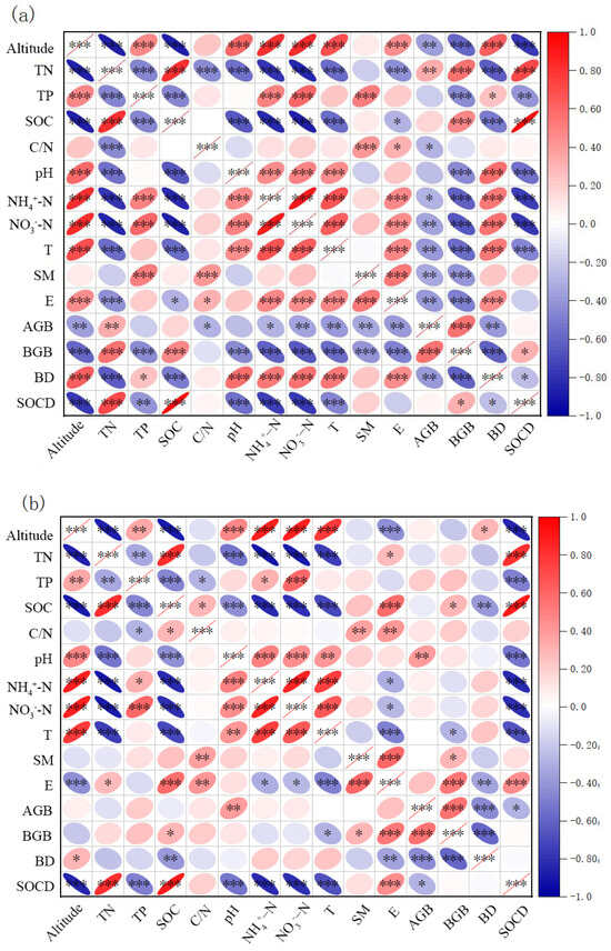 In areas affected by plateau pika outbreaks (Figure 2a), SOC content exhibited highly significant negative correlations with altitude, TP content, pH, ammonium nitrogen (NH4+-N), nitrate nitrogen (NO3−-N), temperature, and soil bulk density (p < 0.001), respectively, and a significant negative correlation with EC (p < 0.05). Conversely, it showed highly significant positive correlations with TN content and BGB (p < 0.001). SOCD demonstrated highly significant negative correlations with altitude, pH, ammonium nitrogen, nitrate nitrogen, and temperature, respectively (p < 0.001), significant negative correlations with TP content (p < 0.01) and soil bulk density (p < 0.05), and highly significant positive correlations with TN and SOC content (p < 0.001).