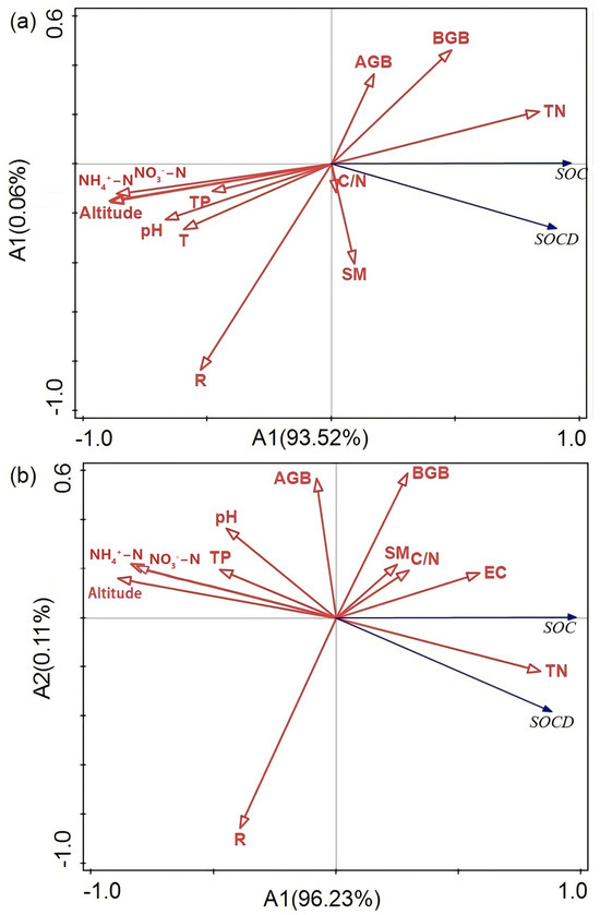 RDA of environmental factors with SOC and SOCD. (a) outbreak areas; (b) non-outbreak area.