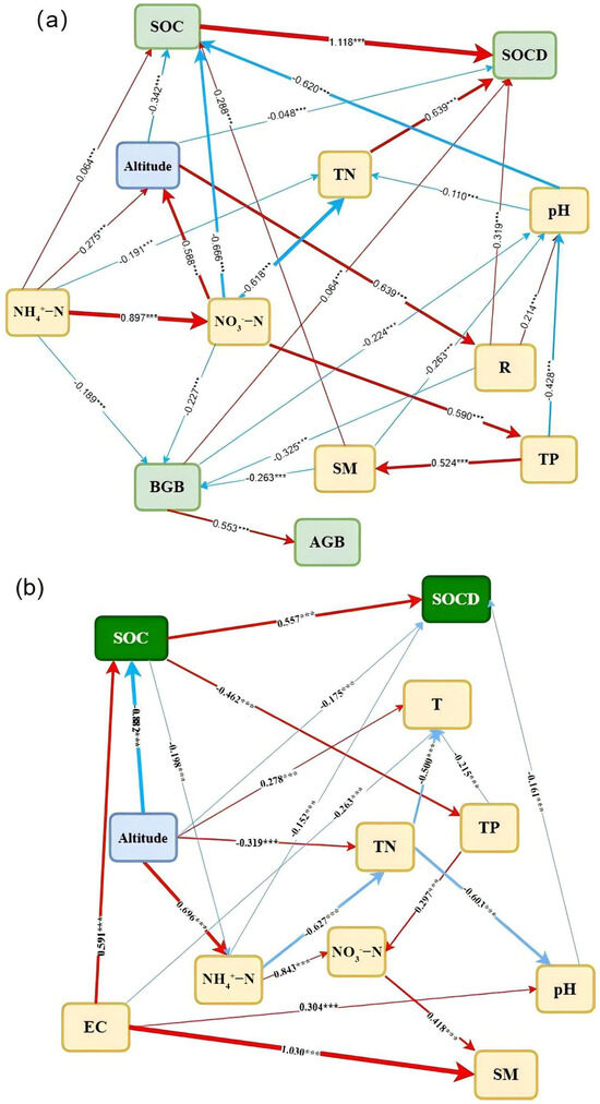 SEM analysis results showing the effects of altitude and various soil properties on SOC and SOCD. (a) Outbreak areas; (b) Non-outbreak areas. Note: Blue lines indicate negative effects, red lines denote positive effects, and line thickness is proportional to the magnitude of effects. *** denotes p < 0.001.
