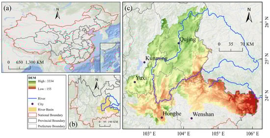 Location of the study area. (a) China; (b) Yunnan Province; (c) The Pearl River source watershed.