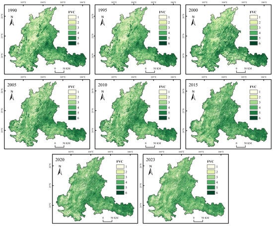 Fractional Vegetation Cover (FVC) is a critical evaluation metric in the ecological restoration and land governance of rocky desertification regions. Remote sensing inversion techniques can provide an accurate evaluation of the proportion of the area covered by vegetation relative to the total surface area in the area [,]. Therefore, this study selected the Normalized Difference Vegetation Index (NDVI) to measure Fractional Vegetation Cover in the study area and, leveraging the powerful capabilities of the Google Earth Engine (GEE) platform, calculated the NDVI values for the study area from 1990 to 2023. The calculation formula used in this study is as follows: