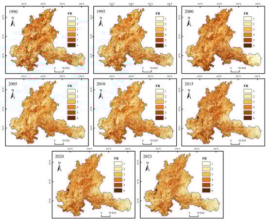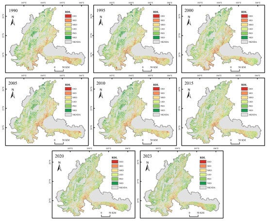 Based on the factor weights derived from the geographic detector analysis during the rocky desertification information extraction process, annual overlay analyses of Fractional Vegetation Cover, Rock Exposure rate, and slope data were conducted for each year within the study period using the Raster Calculator tool in ArcGIS 10.8 [,]. Referring to the Engineering Geological Map of Yunnan Province and the 30-m Resolution Land Cover Dataset of China (1985–2023) provided by Wuhan University [], non-karst areas, urban land, and water bodies—regions where rocky desertification does not occur—were excluded. A mask was created for clipping and integrating the factor layers, resulting in eight phases of spatial distribution maps of rocky desertification from 1990 to 2023 (Figure 4).