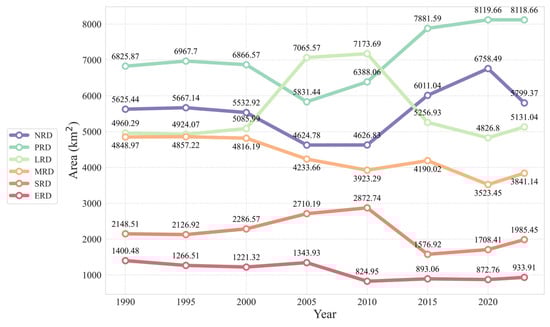 Rocky desertification area changes in the Pearl River source basin (1990–2023). No Rocky Desertification (NRD); Potential Rocky Desertification (PRD); Light Rocky Desertification (LRD); Moderate Rocky Desertification (MRD); Severe Rocky Desertification (SRD); Extreme Rocky Desertification (ERD).