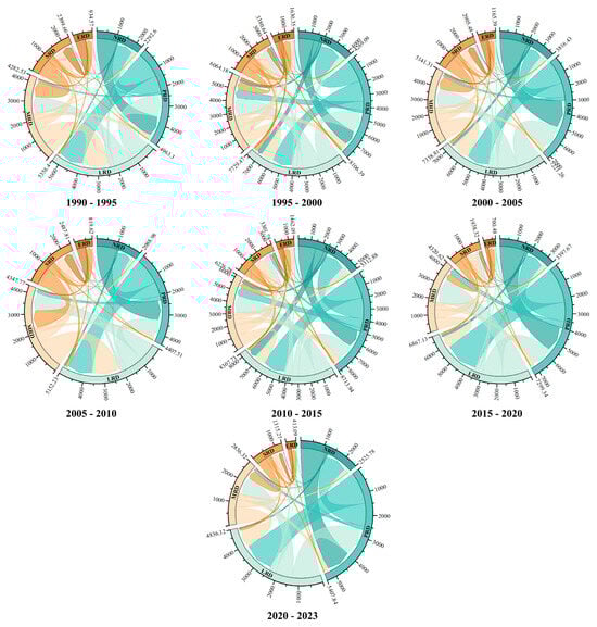 Chord chart of 5-year interval transfer matrix, 1990–2023.No Rocky Desertification (NRD); Potential Rocky Desertification (PRD); Light Rocky Desertification (LRD); Moderate Rocky Desertification (MRD); Severe Rocky Desertification (SRD); Extreme Rocky Desertification (ERD).