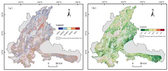 Karst rocky desertification refers to the process of land degradation in fragile subtropical karst environments, where unsustainable human socio-economic activities lead to severe soil erosion, large-scale bed rock exposure, a sharp decline in land productivity, and the formation of desert-like landscapes []. Intensive agricultural practices, driven by heavy population pressure, have made the southwestern karst region one of China’s primary ecologically vulnerable areas for rocky desertification []. Although significant progress has been made in controlling rocky desertification in Southwest China, global warming and increasingly frequent flooding pose risks of re-desertification and further expansion of desertified areas []. Moreover, rocky desertification is closely linked to regional ecological security, agricultural productivity, biodiversity conservation, and sustainable economic and social development. Its management and restoration are crucial for enhancing local living conditions and fostering regional ecological balance [].