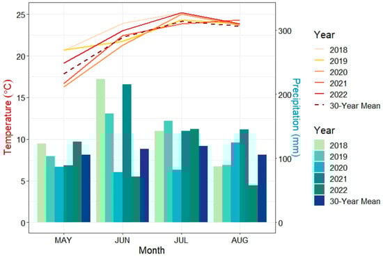 Mean monthly air temperature (°C) and precipitation (mm) for Greeneville, TN, USA, May–August 2018–2022. Weather data obtained from https://www.weather.gov/wrh/Climate?wfo=mrx (accessed on 8 March 2024).