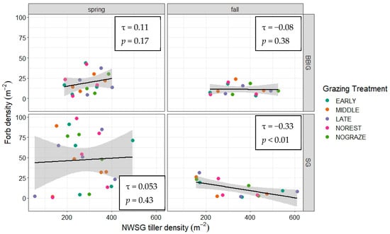 Kendall correlation between NWSG tiller and FORB plant density in BBIG and SG among five grazing management treatments in May (spring) and August (fall), 2018–2022, Northeast Tennessee AgResearch and Education Center, Greeneville, TN. Native warm-season grass, NWSG; forb mixture, FORB; big bluestem/indiangrass mixture, BBIG; switchgrass, SG; early rest, EARLY; middle rest, MIDDLE; late rest, LATE; no rest, NOREST; no graze, NOGRAZE.