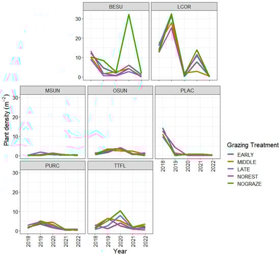 The diversity of forbs in the mixture likely compensated for the varying establishment success among these species. This difference was demonstrated by the early success and persistence of the biennial BESU and short-lived perennial LCOR, followed by increased densities of MSUN, OSUN, PURC, and TTFL by the second year. The more rapidly establishing BESU and LCOR may have also occupied space between the NWSG plants, reducing weeds and other competition sources as the perennial species developed over the later grazing seasons as the dominance of BESU and LCOR diminished. Regardless, biennials (BESU), short-lived perennials (LCOR) and moderate to tall-growing perennials (MSUN, OSUN, PURC, and TTFL) established best. Conversely, smaller annuals (PLAC and PPEA) and perennials (ILBF, PUPC, and upright prairie coneflower, Ratibida columnifera, UPPC) did not establish well. Competition from the NWSG and weeds may have reduced the germination of smaller-growing forbs like PUPC. Poor establishment and persistence of PUPC, ILBF, and UPPC have been previously demonstrated [22], even without grass competition or grazing pressure, suggesting that other factors may affect the establishment or persistence of these forbs. Ecotypes and variants of forb species have also shown varying success in establishment and persistence, particularly through competitive susceptibilities and seed dispersal [23]. The multi-year rest in the NOGRAZE treatment also produced some of the highest densities of BESU, LCOR, PURC, and TTFL. However, each of these four species followed similar trends over the years across grazing treatments (except for BESU in 2021). This similarity suggests that although rest could improve the establishment of more frequently grazed species, a combination of time after establishment and grazing treatment effected forb populations jointly in a complex relationship.