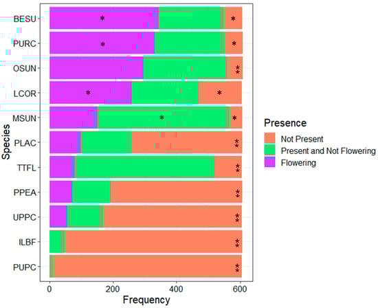 Species demonstrated varying flowering frequencies (χ2 = 3953.3, df = 20, p < 0.01; Figure 4). Black-eyed Susan, PURC, OSUN, and LCOR flowered the most frequently, while MSUN and TTFL were frequently present and not flowering. Illinois bundleflower (Desmanthus illinoensis; ILBF) and purple prairie clover (Dalea purpurea; PUPC) were rarely observed. Grazing treatment did not influence the presence of flowers for any species within the BBIG (χ2 = 30.714, df = 40, p = 0.85; Figure 5) or SG (χ2 = 42.871, df = 40, p = 0.35) pastures.