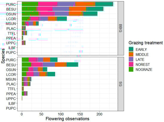 Flowering frequency and duration have also been shown to vary. Long-flowering forbs typically flower earlier in the season and belong to annual or biennial classifications [22]. However, in the current study, the perennials OSUN and PURC both displayed long flowering windows along with BESU and LCOR. All four of these species bloom early- to mid-summer compared to the late-season bloomer MSUN and provide critical floral resources for pollinators coming out of hibernation [24]. Although Harris et al. [24] described a high floral demand in spring, late summer and early fall typically provided the greatest floral deficit to pollinators and is a period when late-season bloomers like MSUN could bridge the gap between floral supply and demand. Despite variations in flowering windows and the total flowering observations made for each species, grazing treatment did not affect the flowering presence of each species. Ravetto Enri et al. [25] showed that excluding cattle during peak blooming periods resulted in three times greater flower cover than areas where cattle were not excluded. Their work also found that cattle grazing did not influence flower cover between continuously and rotationally grazed pastures. Flower cover increased over the three grazing seasons and heterogeneity was greater in pastures grazed by cattle compared to sheep. Although our study did not quantify flower density, it similarly concluded that varying rest regimens and continuous grazing, without overgrazing, should produce viable blooms. Including a variety of species with variable blooming windows provides season-long blooms and floral resources for pollinators without any detriment due to grazing.